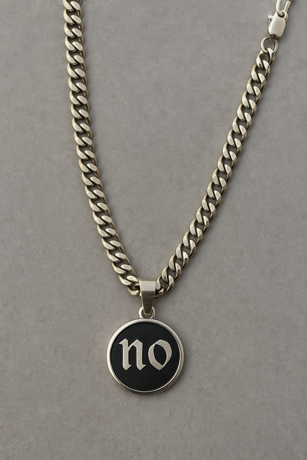 - Pendant Design: Gothic “NO” lettering